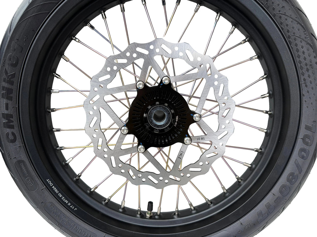 This OEM-style 17” supermoto wheel set is designed specifically for the Sur-Ron Ultra Bee, matching the factory super moto setup in size, fitment, and performance. It’s a complete, bolt-on solution for riders who want a street-focused setup using OEM-correct components.