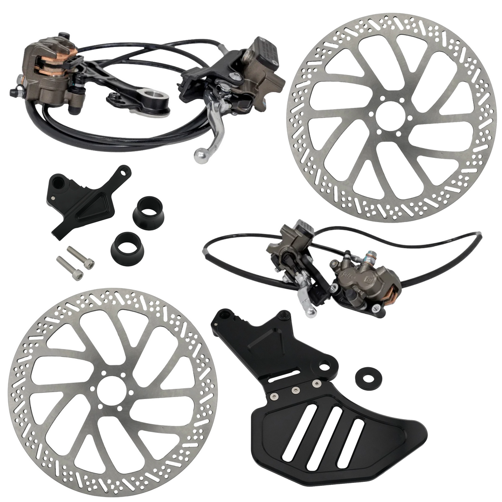 Transform your lightweight e-moto into a true Moto-spec braking machine. This complete bundle includes everything needed to upgrade to full-size Moto brakes: the correct caliper mounting brackets, heavy-duty 240mm Moto rotors, and Moto-style brake calipers (such as Sur-Ron Ultra Bee brakes).