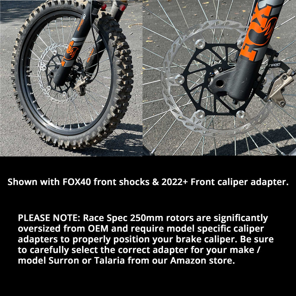 **Please note that Fox40 and Talaria 2022.5+ factory forks require an added m5 x 1mm & 2mm thick spacers for correct figment. The fitment also can vary based on if you have OEM calipers or aftermarket.