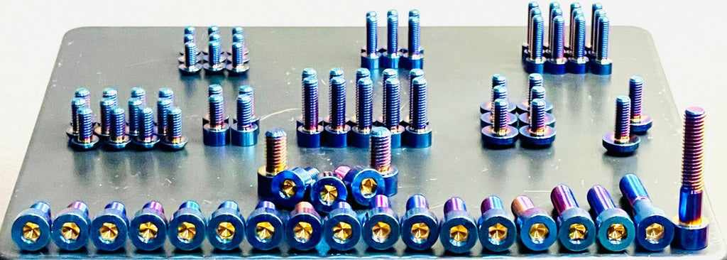 Complete Talaria XXX anodized titanium hardware kit. This kit covers all bolts/ screws that are easily visibly seen. The list is covered in detail below.